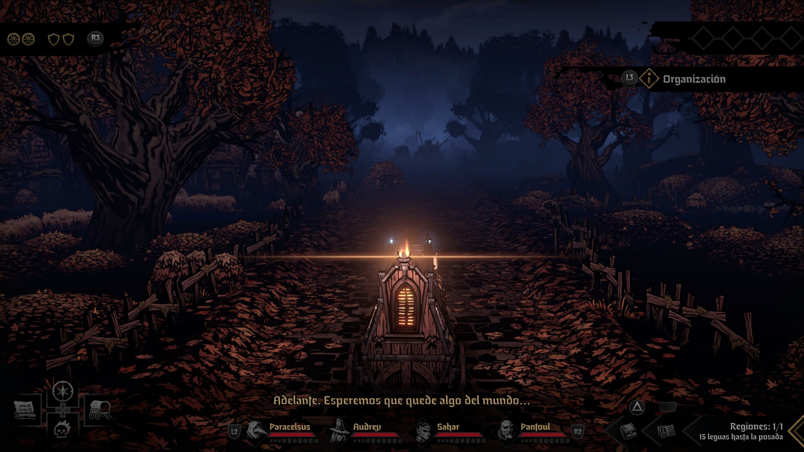 Ese carro en el que viajamos será casi como un personaje más de la aventura, y también podremos emplear para mejorarlo las velas obtenidas a través de nuestros distintos recorridos. Podremos mejorar la resistencia de sus blindajes para resistir emboscadas, la calidad de sus ruedas para soportar las inclemencias del camino, o equiparla con distintos amuletos y herramientas que nos faciliten la exploración, ya sea potenciando estadísticas de los personajes o reduciendo la probabilidad de ciertas amenazas, entre muchas otras variantes. Por ejemplo, si las ruedas de nuestro carro se rompen, nos veremos obligados a parar para repararlas, y en el proceso sufriremos emboscadas en forma de combates en los que tendremos que coordinar el ataque a los enemigos con la reparación del carro. Por otro lado, el carro tiene otro papel clave, e icónico, para el juego, y es que porta la imprescindible llama que nos mantiene a salvo en el mundo de Darkest Dungeon.