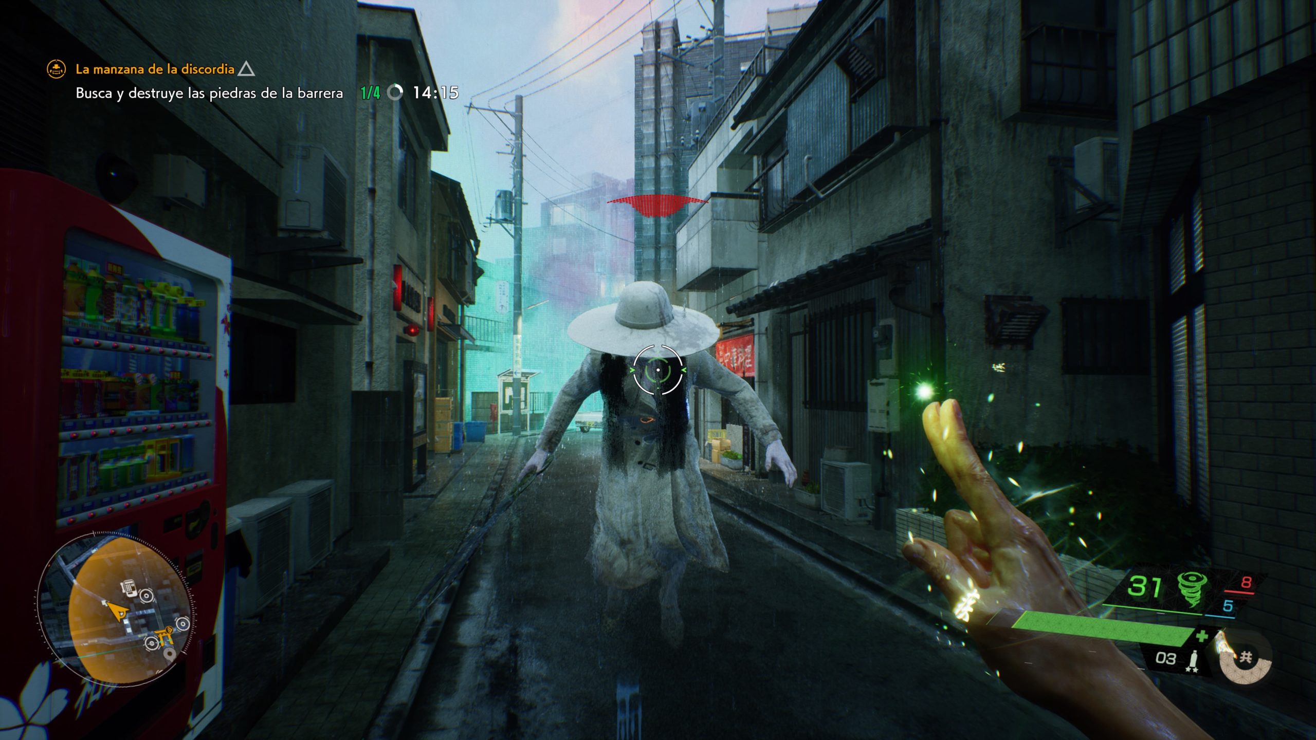 Sin embargo, nuestra visita a Tokio no será un paseo turístico. Como mencioné anteriormente, los visitantes campan a sus anchas por la ciudad, y tratarán de eliminarnos constantemente. Para combatirlos no tendremos armas, al menos no las armas que estamos acostumbrados a utilizar en un videojuego. Nuestros métodos de defensa principales serán de origen místico, una serie de conjuros asociados a los elementos, concretamente al fuego, agua y viento. Los aprenderemos guiados por las enseñanzas de KK, y se realizarán mediante una serie de gestos manuales. Las manos del protagonista estarán constantemente en pantalla, en la posición que ocuparía el arma en un shooter habitual, y su postura cambiará en función del conjuro seleccionado. Este método de defensa también está basado en la cultura tradicional japonesa, concretamente en el kuji-kiri, una práctica místico-religiosa del budismo y asociada a la conexión con el mundo sensorial. Utilizaremos estos poderes como armas directas contra los visitantes, disparando proyectiles espirituales contra ellos hasta eliminarnos directamente o, lo que sucede más comúnmente, dejar su núcleo expuesto. Una vez que esto pasa tendremos la oportunidad de utilizar los hilos espectrales o tejido etéreo para aferrarnos al núcleo del visitante y arrancárselo, matándolo en el acto. Se trata de una suerte de exorcismo o expulsión del mundo terrenal. Esto último también podremos hacerlo directamente, sin daños previos, si nos acercamos con sigilo al enemigo.