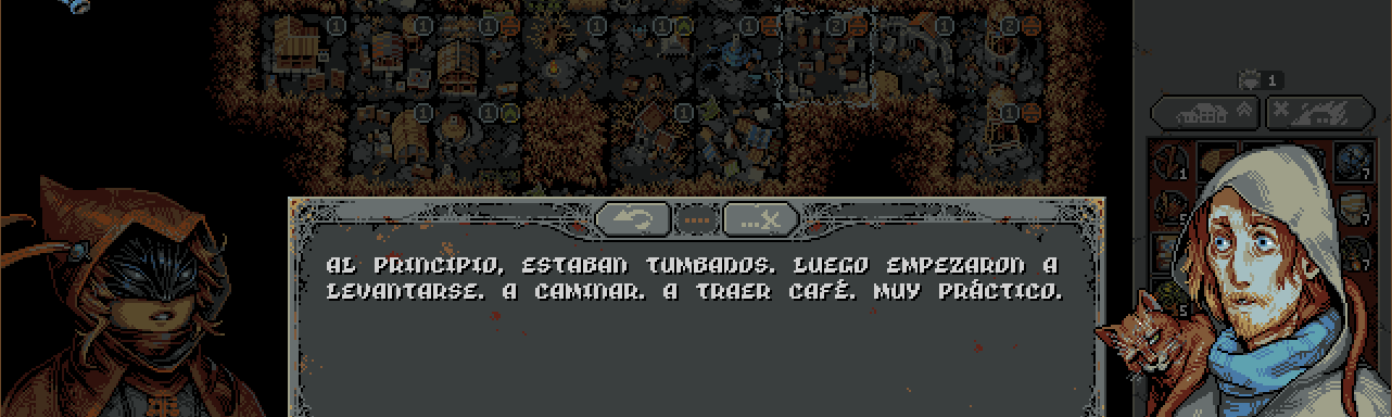 Una de las primeras cosas que recordaremos será la fogata, el espacio donde descansar y relajarnos tras cada una de las expediciones que hagamos. En esta nos recuperaremos, administraremos las cartas que irán apareciendo en nuestro viaje e interactuaremos con otras personas, las cuales, a diferencia de nosotros, no recuerdan nada de lo que había antes allí, por lo que, para aumentar nuestro campamento y poco a poco darle forma, pasará de nuevo por nuestras manos tal deber, ya que no solo ayudará a que el mundo sea recordado, sino que recibiremos ventajas permanentes o incluso nuevas cartas que nos ayudarán. Todo Loop Hero está envuelto por una música sublime que acompaña en estilo a ese pixel art tan característico y tan retro, donde nuestro personaje y las estructuras que vayamos añadiendo no serán más que unos píxeles gruesos apilados de forma magistral y coloreados con una paleta muy destacable. Esta sensación se rompe cuando se inicia una conversación de nuestro héroe con alguna entidad, ya sea alguien del campamento o algún enemigo que decide dedicarnos unas palabras antes del combate. Los retratos que adornan dichos diálogos son radicalmente distintos, pues pasa de un pixel tosco a uno mucho más pequeño y detallado, dejando de esta manera unos iconos muy expresivos y que rompen con ese bucle en su apartado artístico.