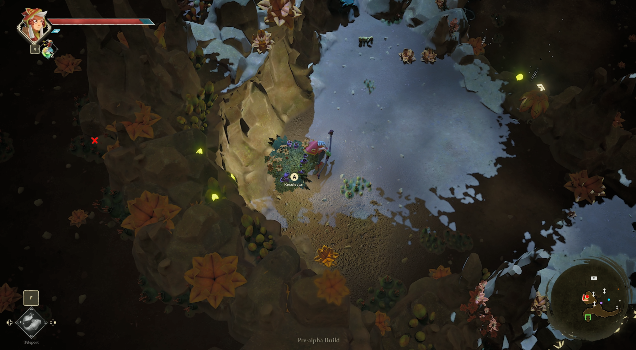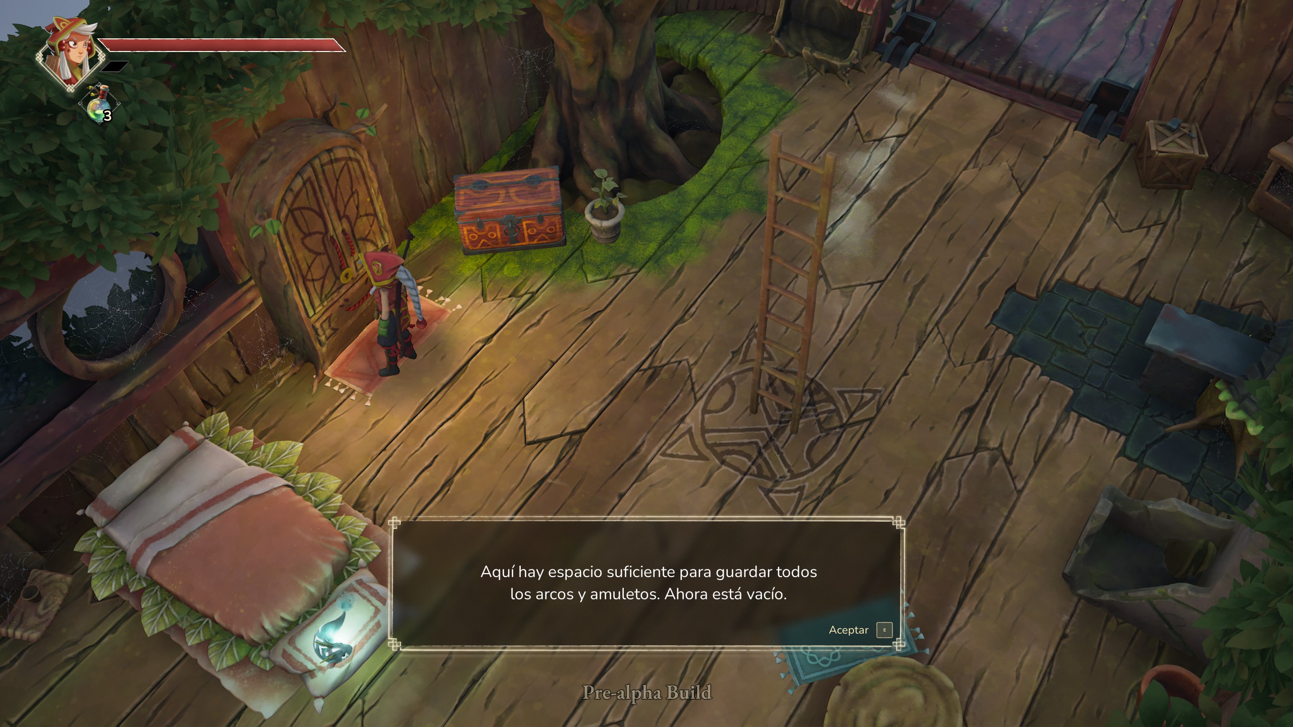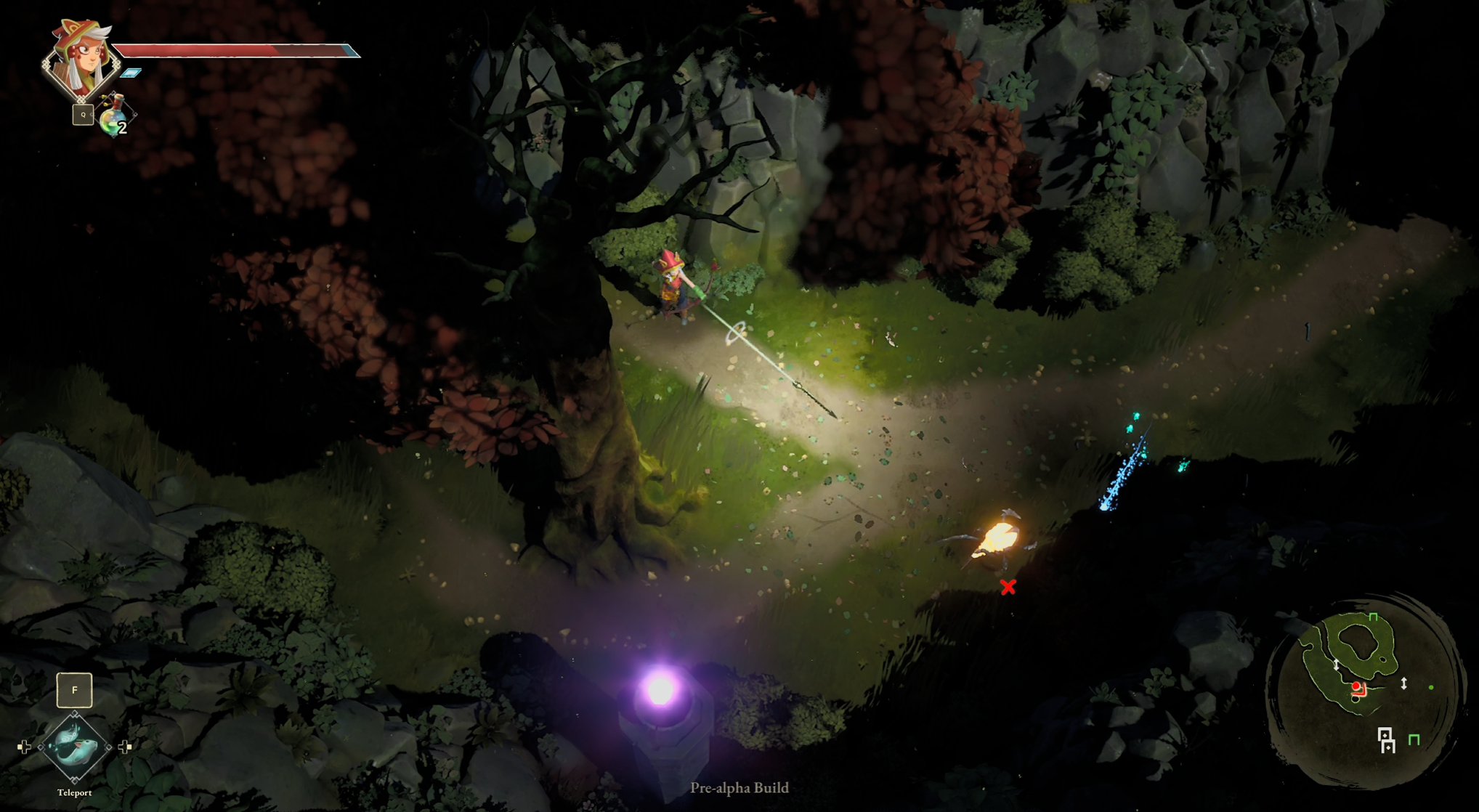 Wandersky se nos presenta como un juego de aventuras en vista cenital, en el que llevamos a una arquera que solo tiene una flecha; con esto, ya nos vienen a la cabeza los principales referentes de esta propuesta, Zelda y Titan Souls. Y Wandersky no se esconde; en su planteamiento de las mazmorras, en puzles sencillos pero efectivos, en su estética, e incluso en los efectos de sonido, podemos reconocer la inspiración que han tenido las peripecias de Link; mientras que en sus mecánicas de movimiento y combate se distingue clara la silueta del éxito de Devolver. Sin embargo, lo que más destacaría de esta pequeña prueba es donde ambos conceptos confluyen, y es que podemos mover con una suerte de telequinesis aquello que golpeemos con nuestra flecha; si bien es algo que ya hemos visto, me ha gustado como convierte el combate uniságito en una suerte de puzle, permitiéndonos arrancarles la armadura a los enemigos, e incluso manipular su posición para lanzar a los unos contra los otros, de importancia especialmente al enfrentarnos con el jefe. Este combate nos ha dejado ver también que en Tiny Potion Tree apuntan a una experiencia con una dificultad elevada, sin llegar quizás al punto de Titan Souls, pero muy por encima de lo que esperaríamos en un Zelda; teniendo cosillas prestadas de los «souls», como las curaciones limitadas y, sobre todo, la estrategia al usarlas, ya que beber una poción es una acción lenta y pesada. Teniendo esto en cuenta, podría decirse que Wandersky se parece más a Tunic que a los Zelda cenitales, un planteamiento que se refuerza al ver el diseño de los niveles a distintas alturas.